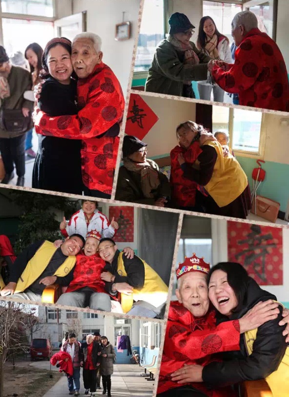 “王者雄风一百年,永昌康健乐心安。山川日月长相伴,寿诞今朝相聚欢。”志愿者辛老师即兴赋藏头诗一首《贺王爷爷寿》。二十多位志愿者围坐在两张大餐桌旁热热闹闹地吃着百岁寿宴,大家谈论着仁爱,谈论着孝道,谈论着健康。整个过程就是四和仁爱这个大家庭给王爷爷操办的一个仁爱之家的别具一格、独一无二的百岁生日Party!