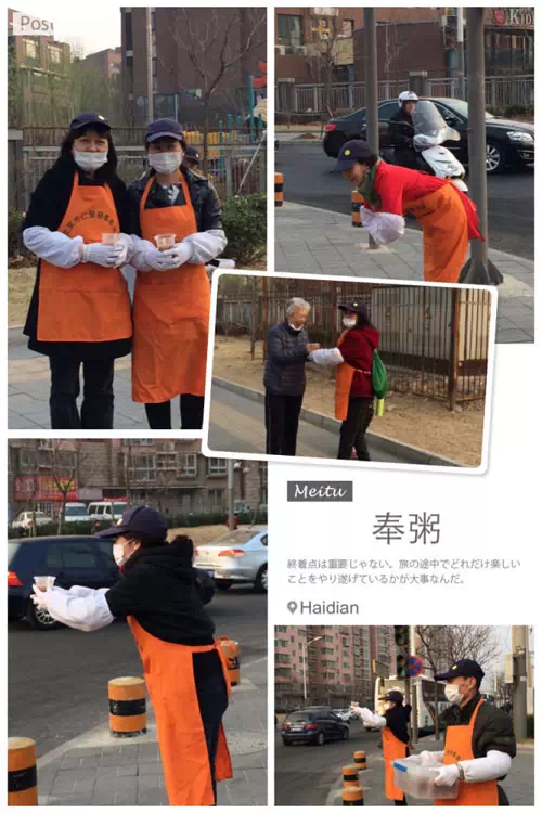 来到奉粥点,卸下粥车物资,组织大家排两排按广播体操队形站好,由高峰老师前面带领,在奉献一份爱的歌声中做手语操。对于每天也很忙碌的志愿者来说,关注天气的并不是很多,所以我在前行中加入了每日天气预报的内容,今天3月26日,6摄氏度,多云,北京中度污染。在合影,激励之后开始奉粥。
