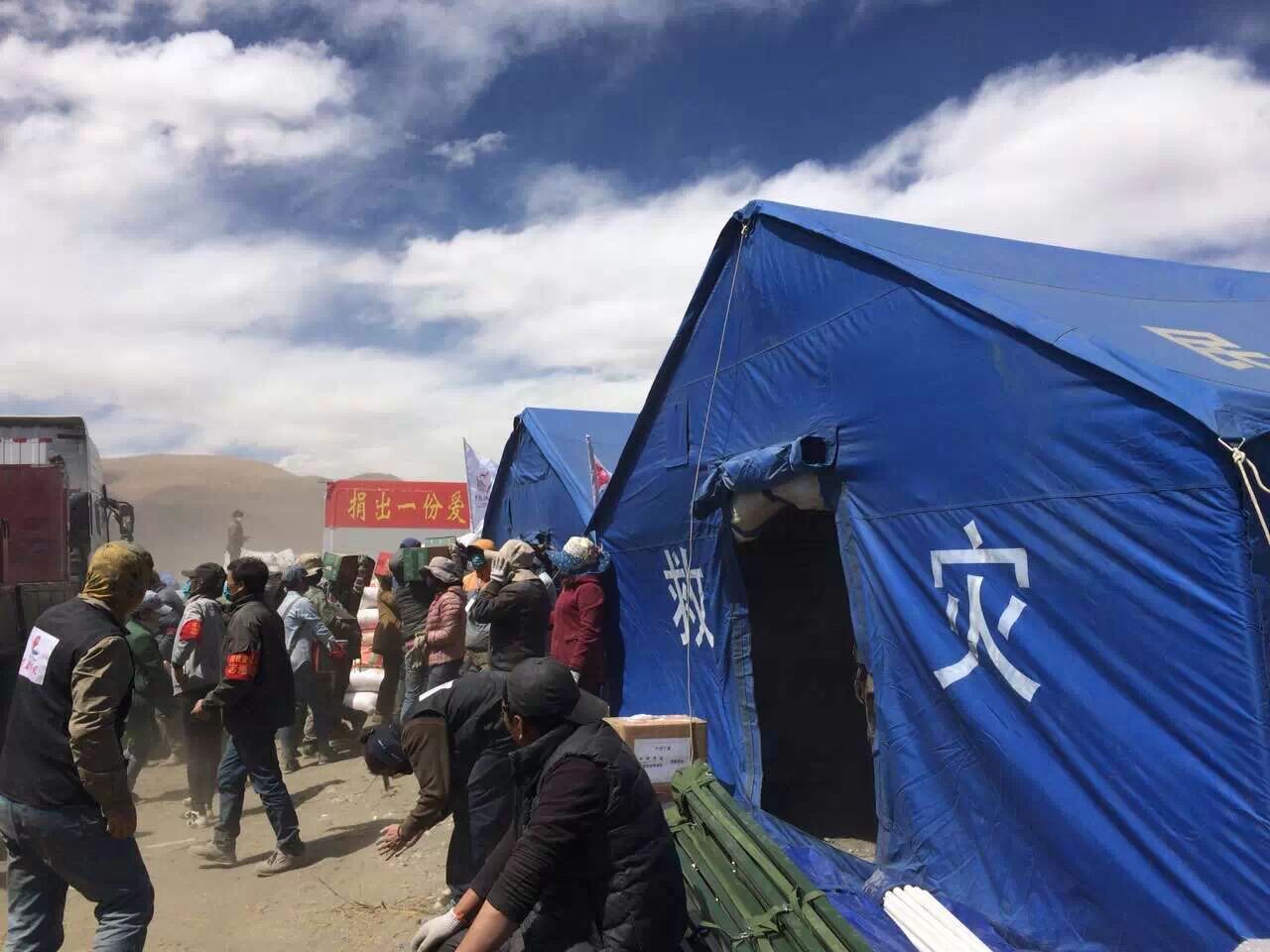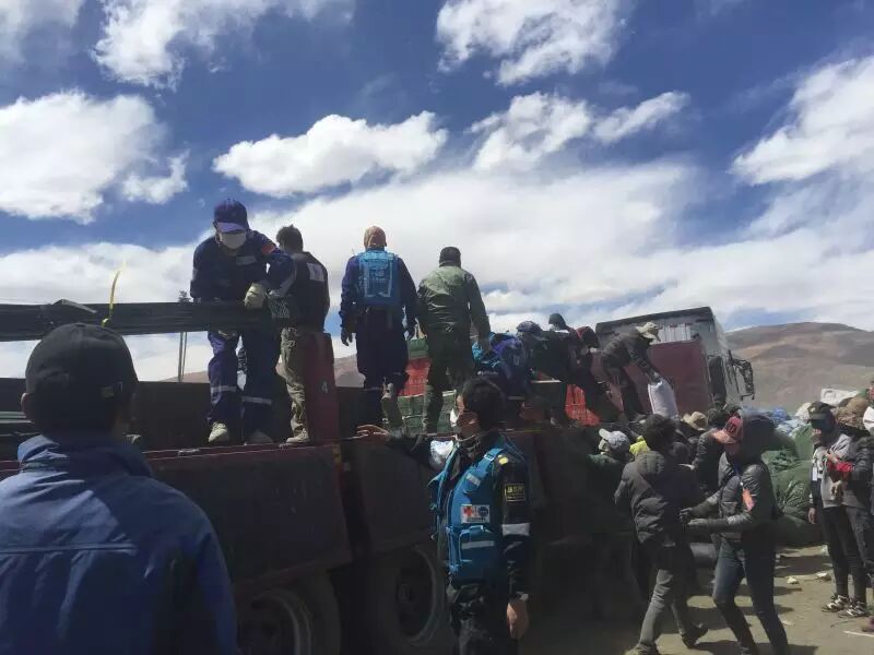 一路上,藏区海拔不断提高,翻越5100米的垭口对于仁爱救援队员来说的确是个考验,不过好在没有出现剧烈的高原反应。而且,刚到拉孜县城,车队就碰到了在以往多次救灾中结下深厚友谊的“谷子”队长,进一步证实到拉孜安置点急需物资。就这样,我们几个公益团队就继续前往设在郊区的灾民安置点。