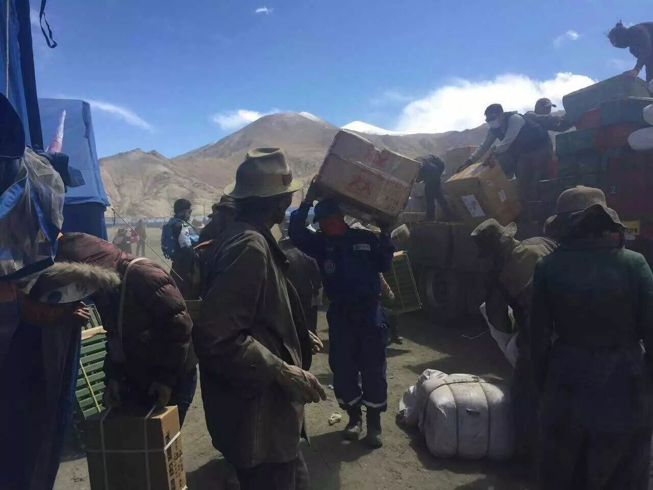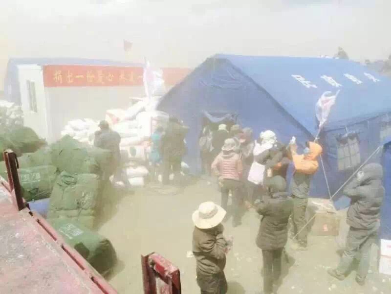 卸货刚开始,安置点里的灾民就主动过来帮我们卸载物资,一个个争先恐后的,专挑最重的东西来搬,一阵狂风袭来,我们都看不见人了,但是西藏人民依然没有停下来,一方面可以看出西藏人民的淳朴善良,另一方面可以看出灾区人民与全国公益团队和谐互助的场面。尽管语言不通,但是从灾民的眼神和表情可以看出他们对我们的到来是非常感激的!