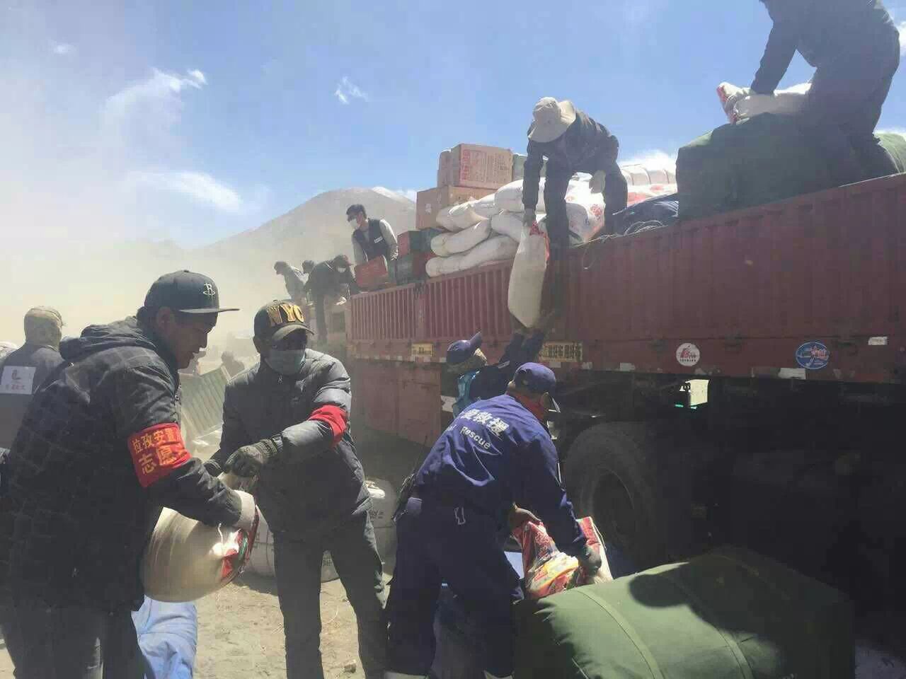 拉孜安置点也是设立在郊区的平坦地方,风沙满天、尘土飞扬,帐篷等各类基础设施都是刚刚设立的,如今800多灾民生活困难,急缺生活物资,仁爱这一卡车的物资是所有公益机构中第一批抵达的,能够解决他们的燃眉之急!与拉孜民政局沟通后,我们几个公益团队决定将整车的救援物资卸到这里,送到最需要的人的手里。