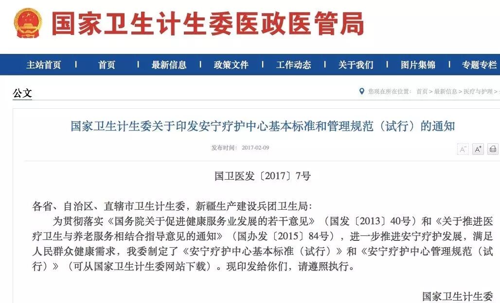 2017年2月9日,国家卫生计生委发布了《关于安宁疗护中心基本标准和管理规范(试行)的通知》,这标志着安宁疗护已从国家政府层面开始实施推广。